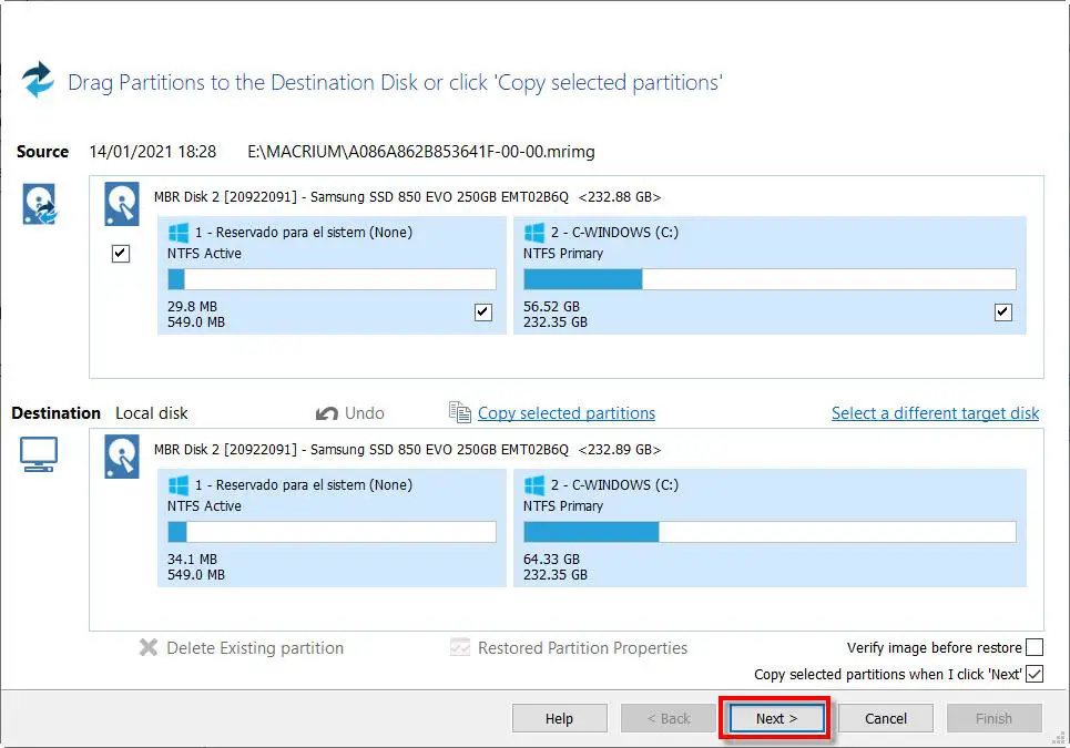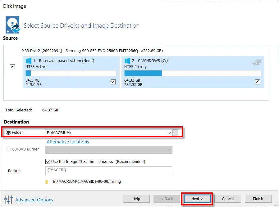 Ce programme détectera automatiquement toutes les partitions liées au démarrage de Windows (démarrage et données). Tout ce que nous avons à faire est d’entrer le dossier de destination. Si possible, mieux vaut sauvegarder sur un autre disque dur. De cette façon, si une panne matérielle survient, nous n’aurons pas perdu les données. La prochaine chose que nous devons faire est de cliquer sur Suivant .