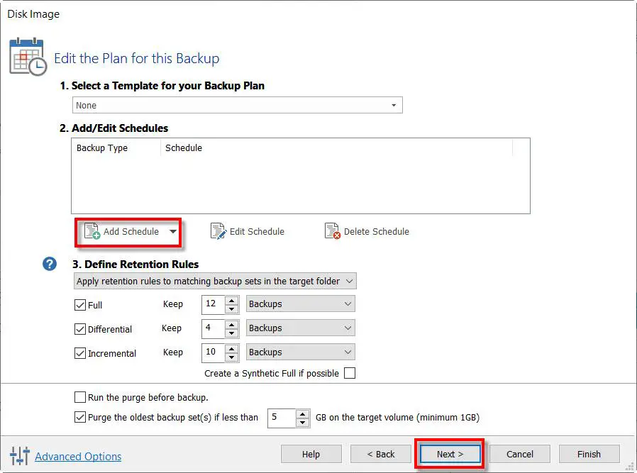 Ce que nous allons faire, c’est cliquer sur Suivant, mais si vous souhaitez créer une tâche pour effectuer une sauvegarde régulière, nous cliquerons sur Ajouter une planification .