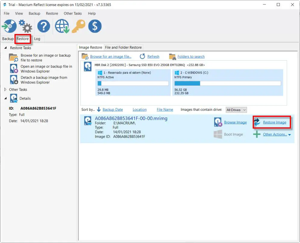 Dans le cas où nous souhaitons restaurer une sauvegarde précédemment créée avec Macrium Reflect, nous devons sélectionner l’onglet Restaurer marqué d’une case rouge. Ensuite, nous verrons un récapitulatif de nos disques durs et des copies créées.