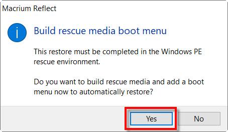 Ici, il nous dit que la restauration nous oblige à utiliser le mode de secours Windows PE et à cliquer sur Oui .