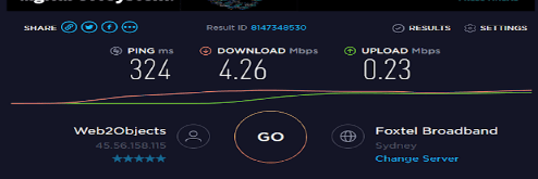 Le test du serveur Melbourne, en Australie, nous a donné un temps de ping de 324 ms , un temps de décharge de 4,26 Mbps et un temps de charge de 0,23 Mbps .