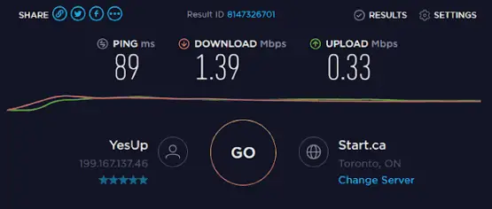 La connexion à un serveur à Toronto, au Canada , nous a donné un ping de 89 ms (amélioration!), Un téléchargement de 1,39 Mbps et un téléchargement de 0,33 Mbps .