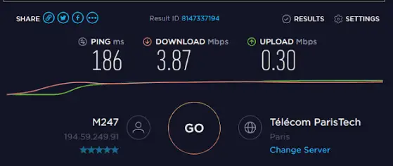 Lors de la connexion à un serveur à Paris , nous avons obtenu un temps de ping comparable aux autres serveurs de l’UE de 186 ms , un temps de téléchargement de 3,87 Mbps et un temps de téléchargement de 0,30 Mbps .