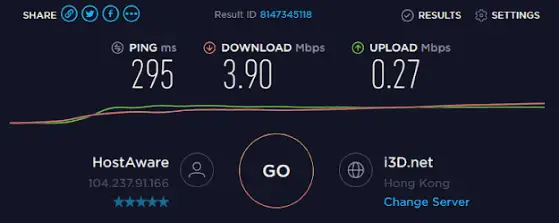 Pour la région Asie-Pacifique, nous choisissons un serveur à Hong Kong et en Australie. Le test du serveur de Hong Kong a renvoyé un ping de 295 ms , un téléchargement de 3,90 Mbps et un téléchargement de 0,27 Mbps .