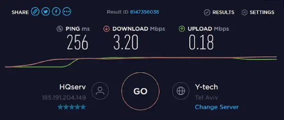 Enfin, le serveur israélien de Tel-Aviv nous a donné un temps de ping de 256 ms , un téléchargement de 3,20 Mbps et un temps de téléchargement de 0,18 Mbps .