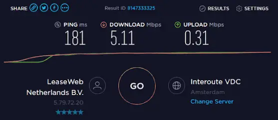 Lorsque nous nous sommes connectés à un serveur aux Pays – Bas , nous avons obtenu un temps de ping de 181 ms , un téléchargement de 5,11 Mbps et un téléchargement de 0,31 Mbps .