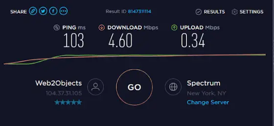 Lorsque nous nous connectons à un serveur local aux États – Unis . Aux États-Unis , nous avons connu un ping de 103 ms , un téléchargement de 4,60 Mbps et un téléchargement de 0,34 Mbps .