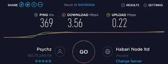 Notre test de serveur sud-africain a renvoyé un ping de 369 ms , une vitesse de téléchargement de 3,56 Mbps et une vitesse de téléchargement de 0,22 Mbps .