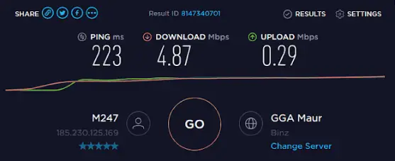 Enfin, notre dernier serveur européen était situé en Suisse . Notre test a renvoyé un temps de ping de 223 ms , un téléchargement de 4,87 Mbps et un temps de téléchargement de 0,29 Mbps .