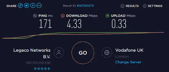 Lorsque nous nous sommes connectés à des serveurs européens, nos temps de ping ont augmenté dans tous les domaines; cela a du sens car cet écrivain est basé aux États-Unis. En tant que tel, il se connecte à un serveur au Royaume-Uni . il a renvoyé un temps de ping de 171 ms , une vitesse de téléchargement de 4,33 Mbps et un téléchargement de 0,33 Mbps .