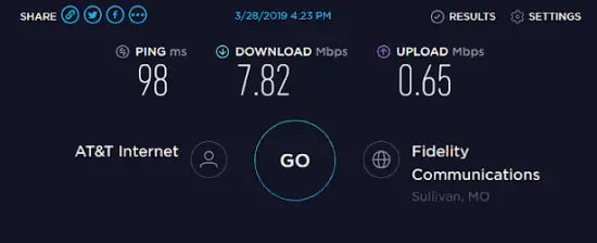 Sans VPN, nous avons connu un ping de 98 ms , un téléchargement de 7,82 Mbps et un téléchargement de 0,65 Mbps . C’est le nombre que nous utiliserons pour comparer.
