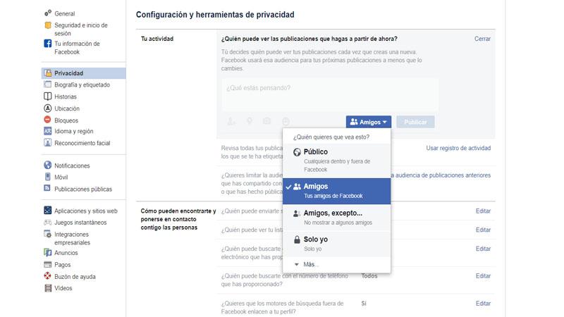 Ici, nous pouvons choisir qui peut voir nos publications. Notre conseil est de les configurer pour que seuls nos amis puissent les voir. De cette façon, nous garantissons que seuls les contacts que nous avons dans la liste d’amis peuvent voir toutes les publications que nous mettons. Nous pouvons même exclure certains amis afin qu’ils ne puissent pas accéder à ces informations.