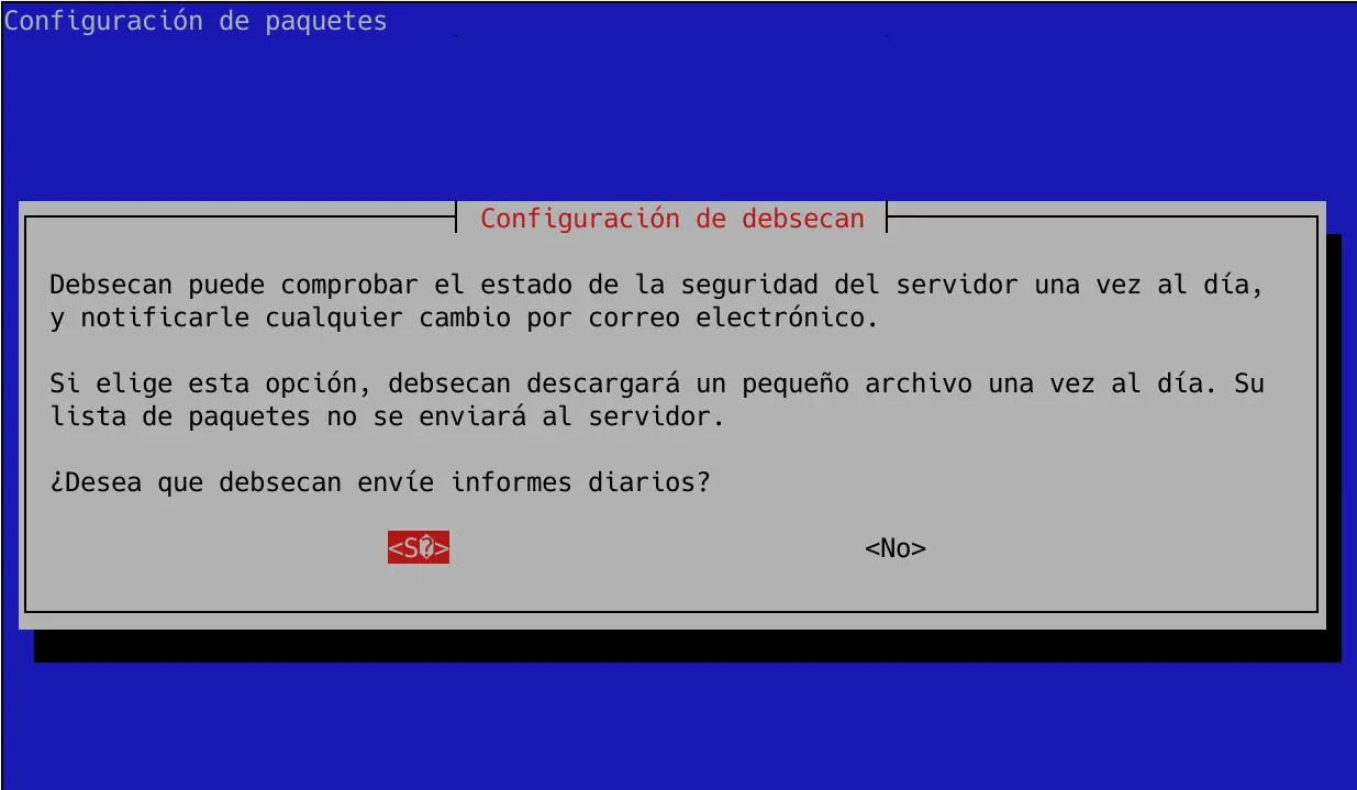 Si nous profitons de l’utilisation de cet assistant de configuration, nous pouvons également configurer debsecan pour nous envoyer automatiquement et une fois par jour, tout changement qui se produit dans les vulnérabilités par e-mail :