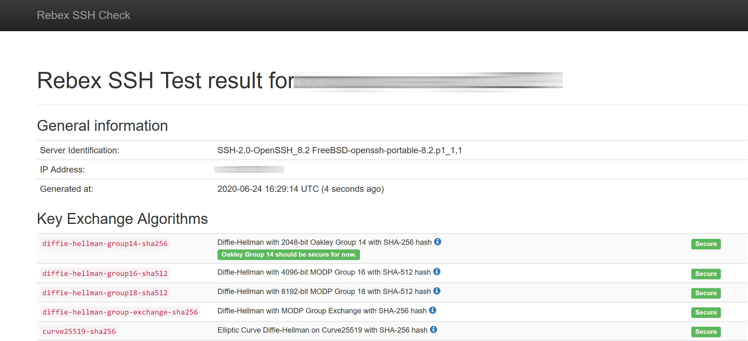 L’ outil Rebex SSH Check gratuit et en ligne effectuera une analyse rapide des algorithmes d’échange de clés, des algorithmes de cryptage symétrique, de l’algorithme de clé, ainsi que des algorithmes MAC que nous avons actuellement configurés sur notre serveur SSH. Si nous utilisons un algorithme qui n’est actuellement pas considéré comme sûr, il nous l’indiquera, afin que nous puissions ultérieurement configurer correctement le serveur SSH et supprimer cet algorithme de ceux «autorisés».