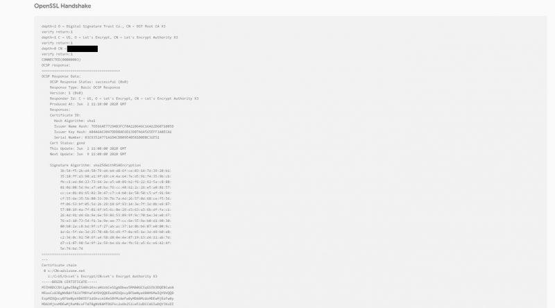 À la fin de chaque test, un exemple de prise de contact du protocole OpenSSL est laissé. Il nous donne une démonstration de la façon dont le client et le serveur Web négocient pour atteindre l’instance d’authentification. Ceci, pour garantir que la communication entre les deux parties en ce qui concerne les demandes Web est donnée de manière sécurisée et privée.