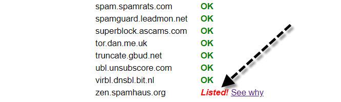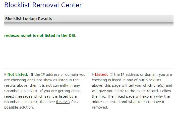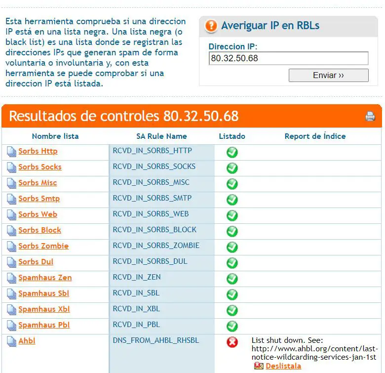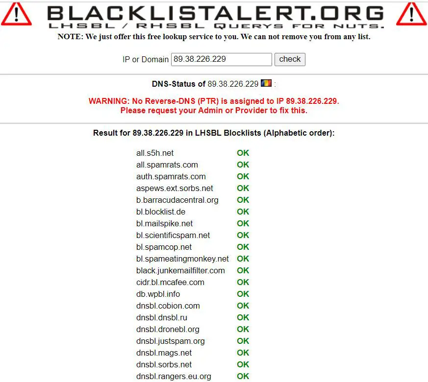 Lorsque vous affichez les résultats avec un OK vert , cela signifie que tout est en ordre. Au lieu de cela, lorsqu’il apparaît en rouge et indique Listed ! comme dans le cas ci-dessous, cela signifie que cette IP ou ce domaine est sur une liste noire.