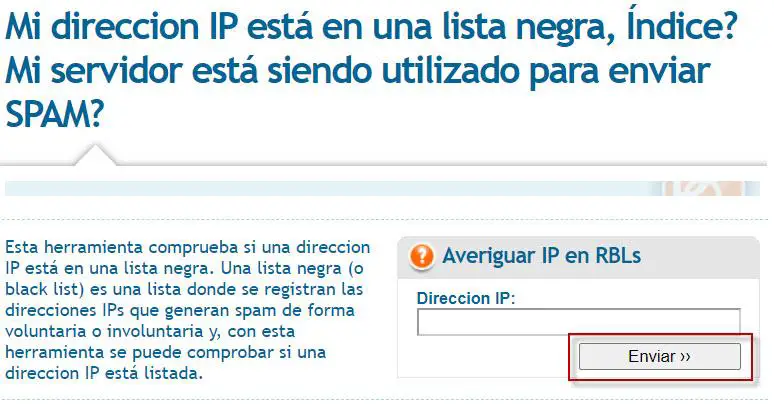 Grâce à DNSQUERIES.COM nous pourrons vérifier si une IP est sur une liste noire qui envoie du SPAM. Pour utiliser cet outil nous irons sur votre site web, nous pourrons avoir une adresse IP et nous cliquerons sur le bouton Envoyer .