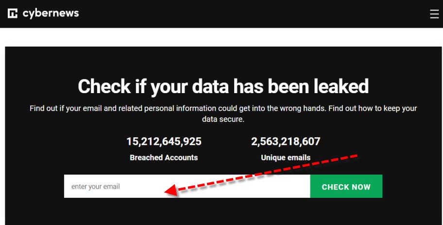 Pour vérifier si l’e-mail et le mot de passe font partie des millions de fuites, nous devons taper l’adresse e-mail dans le champ de recherche. Dans ce cas, nous nous référons à la zone blanche indiquée par la flèche rouge et qui dit « entrez votre email ». Une chose positive est que Cybernews prétend que l’e-mail que nous entrons n’est enregistré, enregistré ou stocké nulle part.
