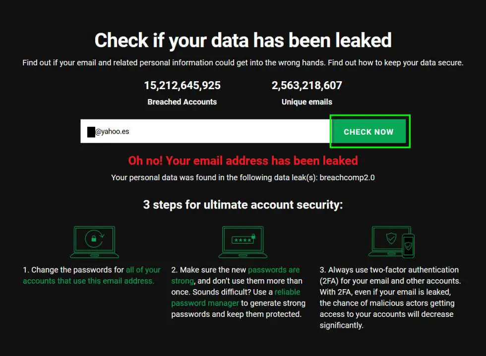 Nous allons répéter la même mécanique que précédemment. Nous entrons notre e-mail et appuyons sur le bouton VÉRIFIER MAINTENANT . En supposant que votre e-mail et votre mot de passe soient parmi les millions filtrés, cela donnera ces résultats :