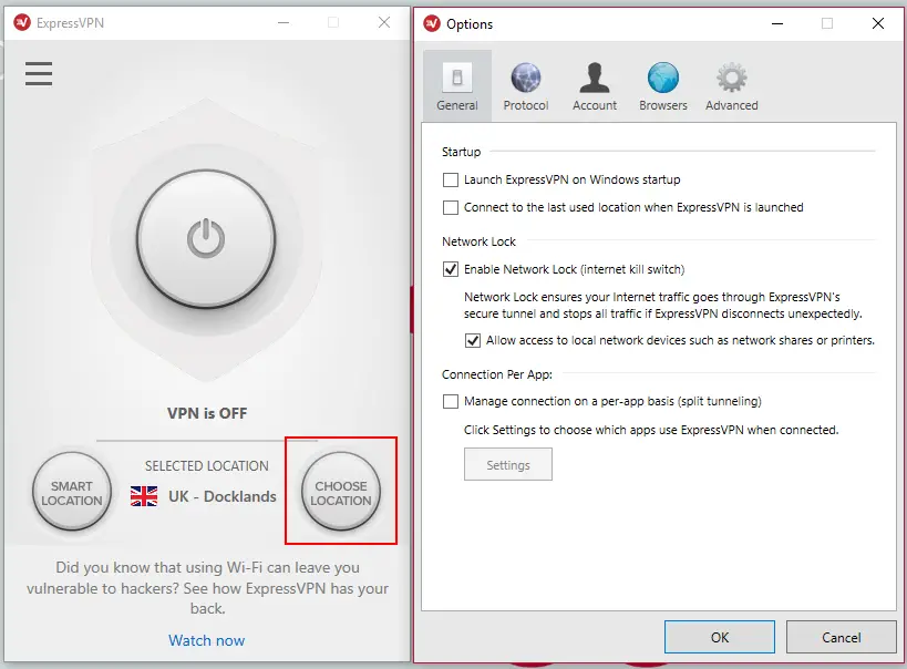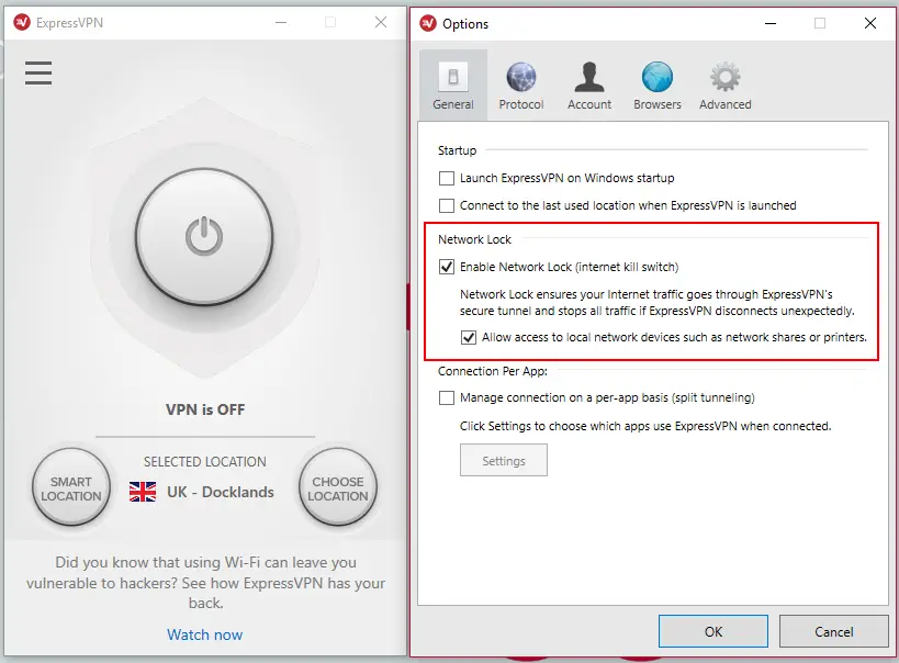 Il est également important de permettre à l’ interrupteur d’ interruption dans ExpressVPN . Cela signifie que si vous êtes déconnecté du VPN pour une raison quelconque, votre connexion Internet sera bloquée pour envoyer accidentellement des données via une connexion non sécurisée. Ceci est particulièrement important lors du torrent, car toute donnée de téléchargement de torrent voyageant sur une connexion non sécurisée pourrait être utilisée contre vous et causer des problèmes juridiques. Pour activer le coupe-circuit, cliquez sur les trois lignes grises en haut à gauche du logiciel ExpressVPN. Cliquez ensuite sur Options qui ouvrira le panneau d’options. Regardez dans leonglet Général la section Verrouillage du réseau . Maintenant, cochez la case qui dit Activer le verrouillage du réseau (déconnexion automatique d’Internet) pour activer la déconnexion automatique. Vous devrez modifier ces paramètres avant de vous connecter à un serveur. Une fois que vous avez fait cela, vous êtes protégé contre l’utilisation accidentelle d’une connexion non sécurisée.