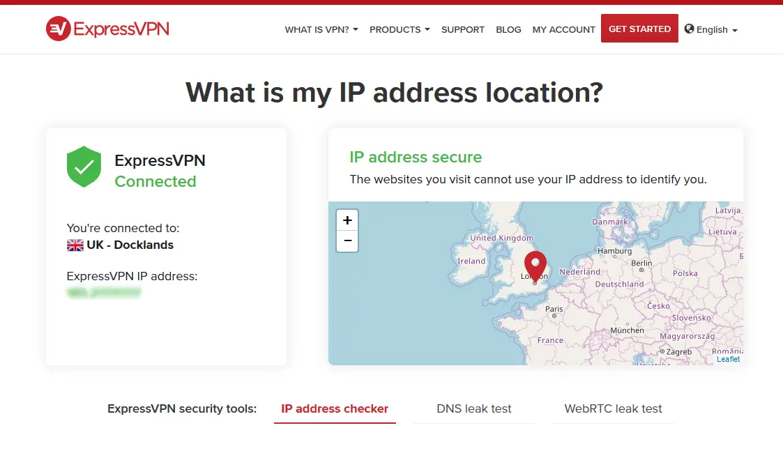 Pour utiliser le vérificateur d’adresse IP, cliquez sur les trois lignes grises en haut à gauche du logiciel ExpressVPN pour ouvrir le menu, puis cliquez sur Aide puis sur Vérificateur d’adresse IP . Cela ouvrira votre navigateur Web à une page du site Web ExpressVPN qui vérifiera votre adresse IP . Sur cette page, vous verrez un symbole de coche verte et un texte indiquant ExpressVPN Connected si tout fonctionne correctement. Vous pouvez également voir votre adresse IP visible en dessous – cette adresse IP doit être différente de votre adresse IP réelle, car l’adresse IP visible est celle qui sera vue par les autres utilisateurs de torrent.Vous pouvez également consulter la carte sur la droite pour voir l’emplacement auquel vous êtes connecté.