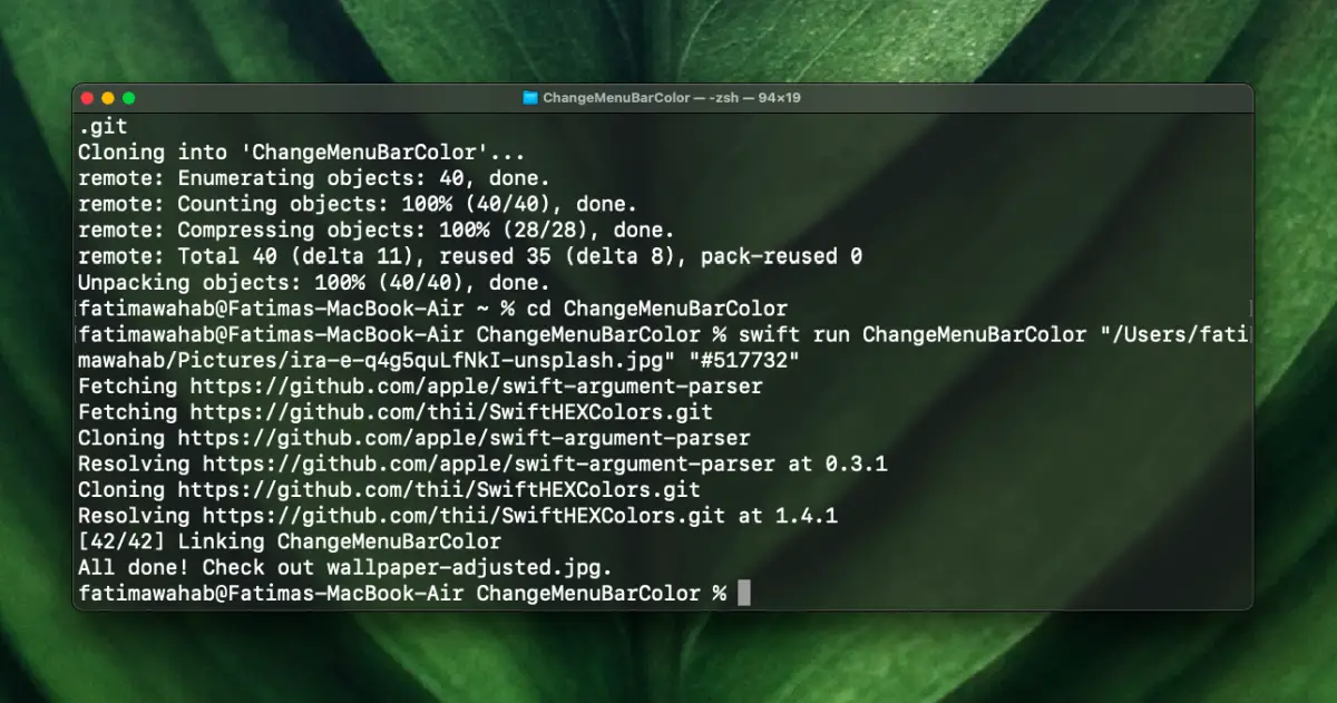 swift run ChangeMenuBarColor "chemin vers le papier peint" "code couleur hexadécimal"