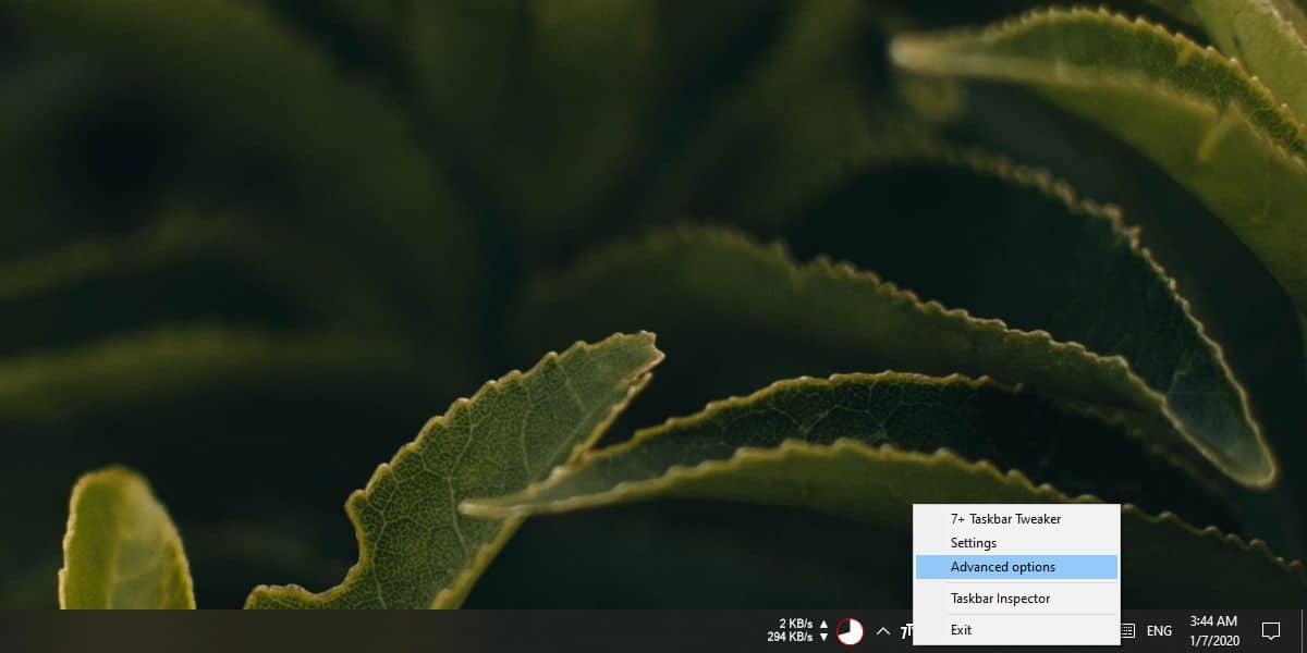 Téléchargez et exécutez 7+ Taskbar Tweaker. L’application a une version portable et une version installable, alors choisissez celle que vous souhaitez utiliser. Une fois l’application en cours d’exécution, faites un clic droit sur l’icône de l’application dans la barre d’état système et sélectionnez «Options avancées».