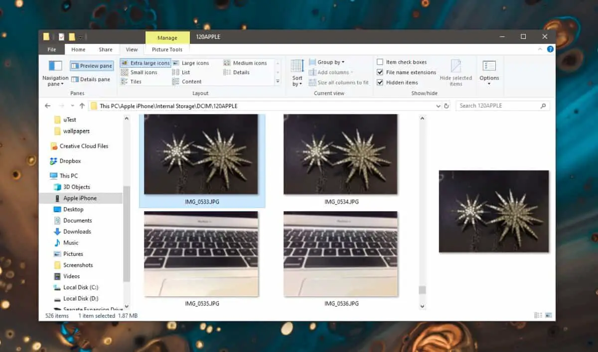 L’iPhone est capable de capturer des photos HDR depuis longtemps. Les photos HDR sont essentiellement trois photos prises et combinées en une seule pour produire une meilleure photo. Si vous souhaitez importer des photos HDR de votre iPhone vers votre bureau Windows 10, vous constaterez qu’il est assez facile à gérer. Les photos seront importées au format JPG.