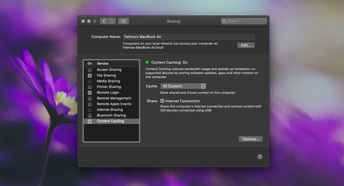 Ouvrez l’application Paramètres et accédez au groupe Paramètres de partage. Dans la colonne de gauche, recherchez «Mise en cache du contenu» et activez-la. Il faut un peu de temps pour commencer. Une fois activé, sélectionnez l’option «Connexion Internet» sur le même écran.
