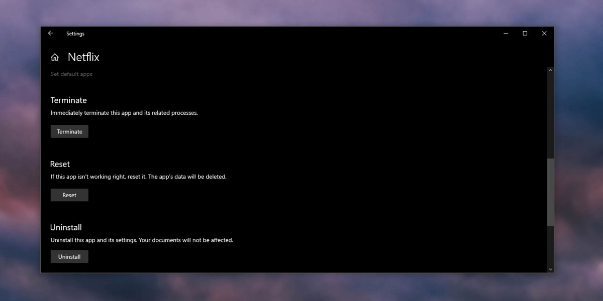 L’erreur Netflix U7353-5101 est plus susceptible d’apparaître dans l’application Netflix pour Windows 10. Si la fermeture et la réouverture ne fonctionnent pas, vous pouvez réinitialiser l’application. La réinitialisation de l’application vous déconnectera de votre compte, mais votre historique de surveillance et les autres paramètres de votre compte resteront intacts (cette solution ne fonctionne pas pour les navigateurs).