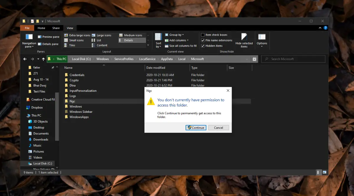 Lorsque vous voyez le message «Vous n’êtes actuellement pas autorisé à accéder à ce dossier», vous verrez généralement un bouton «Continuer» avec le badge d’administrateur. Si vous n’êtes pas connecté en tant qu’utilisateur administrateur, veuillez le faire et essayez d’accéder au dossier.