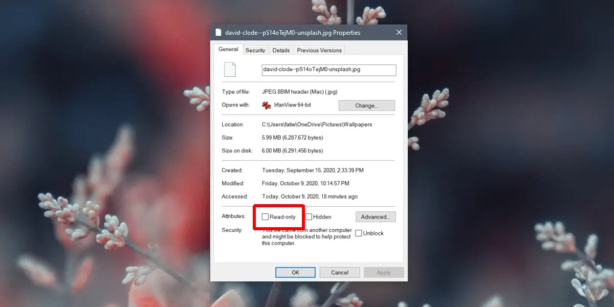 S’il existe une image particulière que vous ne pouvez pas faire pivoter dans la visionneuse de photos Windows, vérifiez si le fichier est en lecture seule. Lorsqu’un fichier est en lecture seule, ses modifications sont verrouillées.