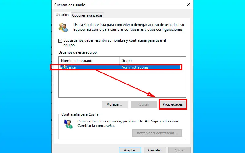 - Une fenêtre s’ouvre dans laquelle vous devez sélectionner les propriétés de l’utilisateur administrateur.