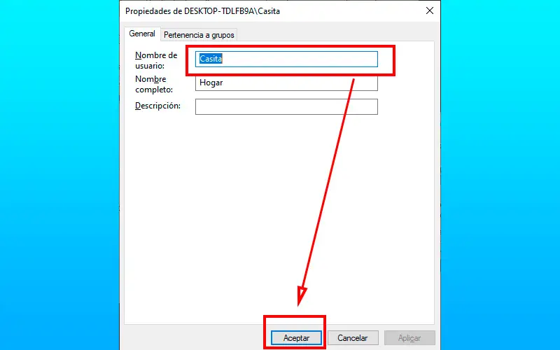 - Dans la barre de texte, écrivez quel sera le nouveau nom de l’utilisateur administrateur de l’équipe.