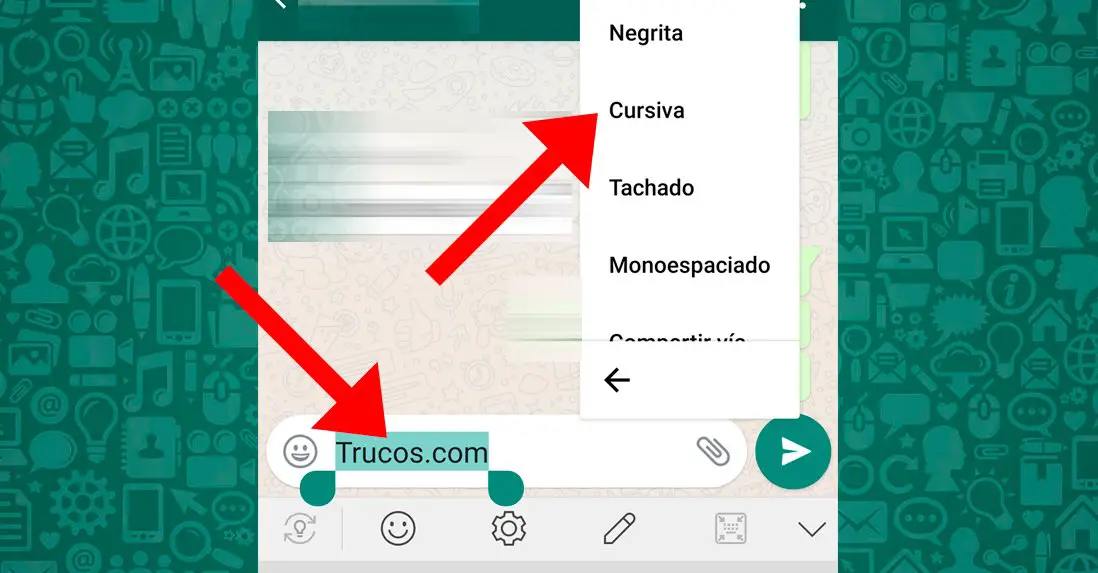 Enfin, si nous voulons écrire du texte en italique dans WhatsApp , encore une fois, nous pouvons choisir entre les deux méthodes des cas précédents, soit par code , soit par sélection de texte . Dans le cas où nous voulons utiliser le code interne de l’application, nous devons introduire des traits de soulignement (_) entre le mot ou la phrase que nous voulons mettre en évidence en italique.