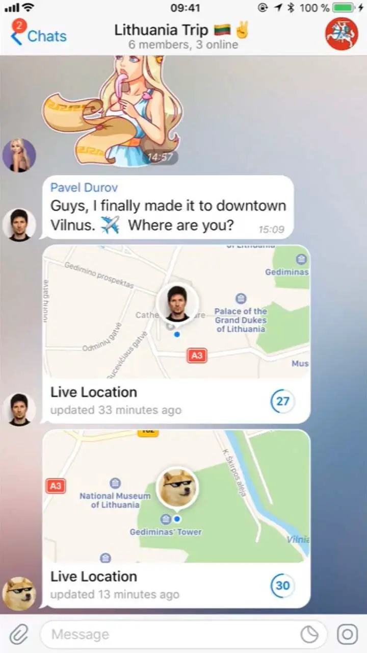 Grâce à la mise à jour 4.4 de Telegram, nous pouvons désormais envoyer notre position en temps réel à nos contacts et décider combien de temps nous voulons que l’autre personne puisse voir notre position , que ce soit 15 minutes, 1 heure ou 8 heures. Pour ce faire, il suffit d’aller dans le menu Joindre et de choisir Emplacement ; il faut ensuite cliquer sur Envoyer ma localisation et Partager avec notre contact. À tout moment, nous pouvons arrêter l’envoi en ouvrant la publication et en cliquant sur Arrêter l’envoi de ma localisation .