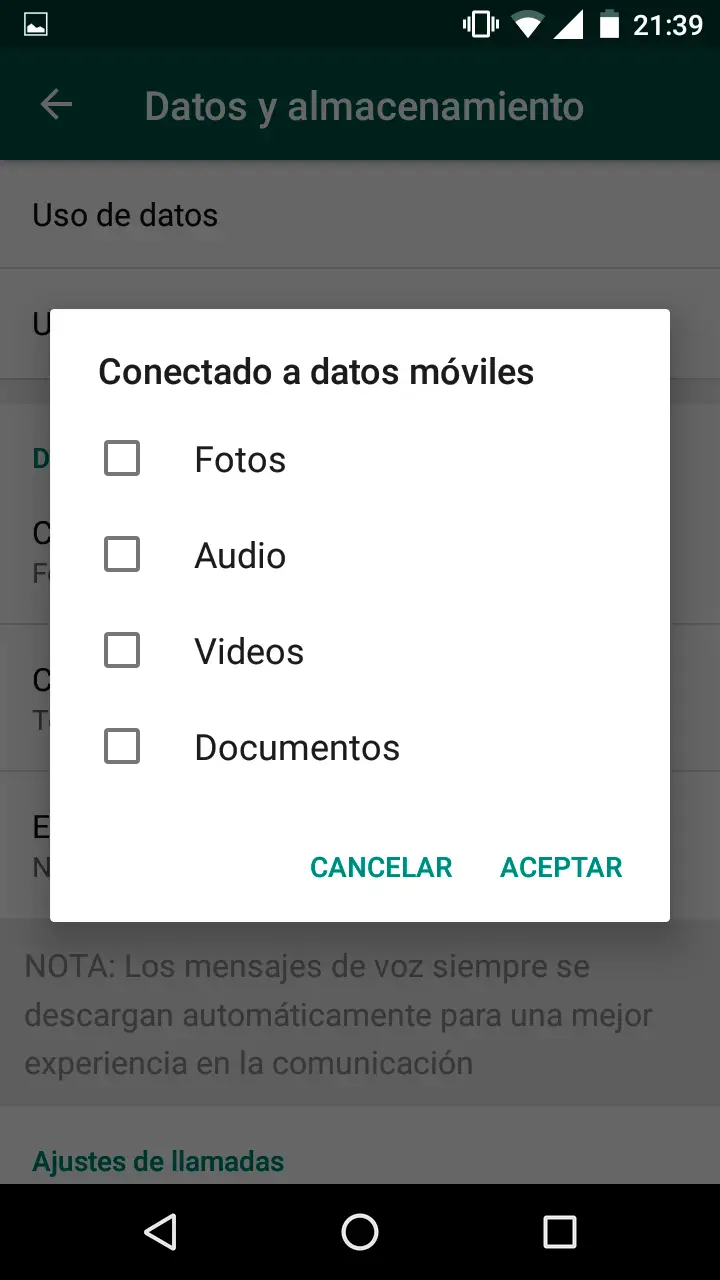 Maintenant, nous pouvons sélectionner les fichiers que nous voulons télécharger ou non via les données mobiles; si nous les désélectionnons , nous empêcherons leur téléchargement via les données mobiles, ce qui nous fera économiser une bonne quantité de Mo de notre tarif.