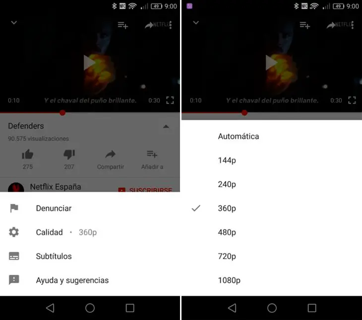 Au-delà de limiter la lecture de vidéos HD sur des réseaux autres que le WiFi, YouTube nous permet également de choisir la qualité de la lecture vidéo et sa résolution ; Comme toujours, plus la résolution d’une vidéo est élevée, plus elle consommera de données de notre connexion. Ainsi, et à partir du lecteur vidéo YouTube lui-même, nous pouvons accéder aux options de lecture pour configurer la qualité vidéo , en choisissant entre les résolutions suivantes:
