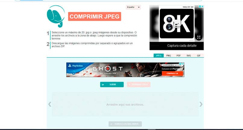 Un outil très populaire parmi les utilisateurs car vous pouvez télécharger des fichiers depuis Dropbox ou Google Drive . Sélectionnez les images et faites-les glisser vers la zone de travail de la page pour obtenir les résultats. Il est utilisé pour compresser les images JPG ou JPEG.