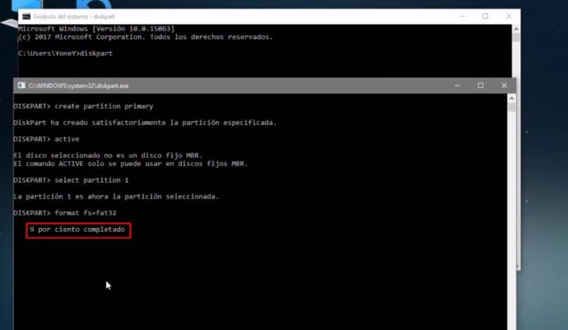 - Ensuite, nous devrons sélectionner la partition pour faire un formatage. Pour ce faire, nous écrivons select partition 1 . Nous confirmons et entrons le format fs = fat32 . Un compte progressif démarrera et commencera à être traité, c’est-à-dire à formater.