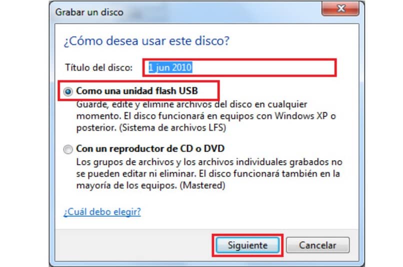 Dans cette option, vous pouvez choisir l’enregistrement souhaité. En tenant compte du fait qu’il existe deux façons de les faire, à savoir: En tant que clé USB ou avec un lecteur CD ou DVD . Dans le cas de la première alternative, l’utilisateur peut enregistrer une partie de l’unité et laisser l’autre l’utiliser quand il le souhaite. Cependant, vous ne pourrez pas supprimer les données déjà stockées.