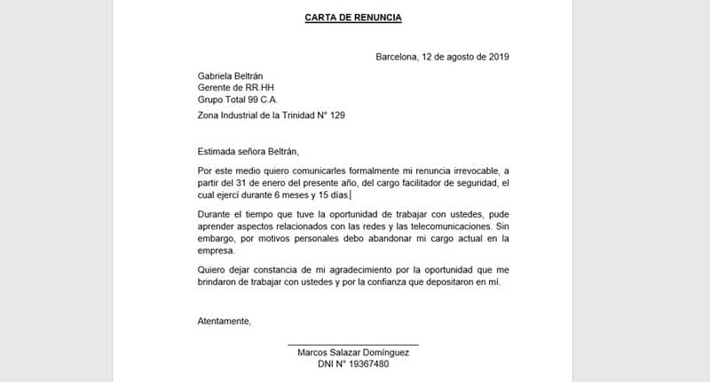 - Dans le deuxième paragraphe, écrivez tout ce qui a été appris au sein de l’entreprise. Les aspects positifs d’avoir travaillé là-bas et de votre équipe de travail. Précisez pourquoi vous quittez l’entreprise , que ce soit pour des raisons personnelles, professionnelles ou académiques.
