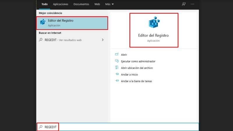- Cliquez sur la section de recherche et tapez la commande « REGEDIT » . Après avoir obtenu les résultats, cliquez dessus avec le bouton secondaire et choisissez l’option «exécuter en tant qu’administrateur».