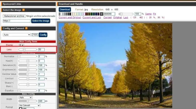 Après avoir choisi l’image que vous souhaitez corriger et l’avoir téléchargée, vous verrez que sur le côté gauche, vous pouvez utiliser plusieurs options. L’option qui nous intéresse s’appelle «Main Config Items» où vous allez modifier le paramètre «Lens» sur une plage de 50-50.
