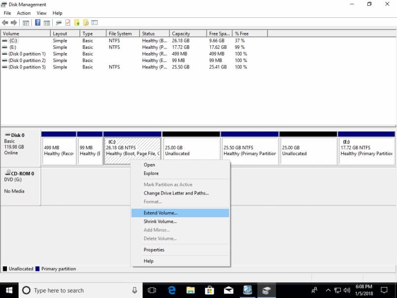 Et puis «Gestion des disques». Sur le côté droit, vous verrez différents graphiques qui vous montreront comment le disque dur est partagé et s’il y a des espaces inutilisés.