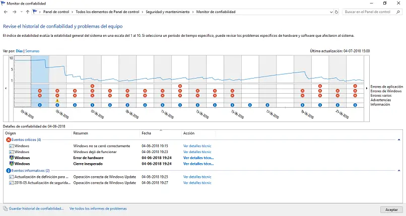 Le rapport de données contient toutes les informations que Windows 10 enregistre sur les pannes du système. Dans le rapport, vous pouvez voir une chronologie où les dernières erreurs système sont reflétées . L’importance est classée en couleurs afin que vous puissiez voir comment les défauts sont répartis. Après cela, pour pouvoir lui accorder toute l’attention requise lors de la résolution des erreurs possibles lors de la mise à jour de Windows 10 .