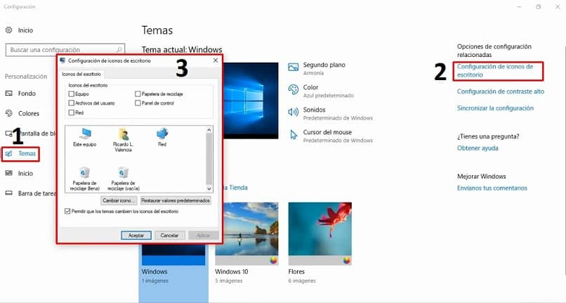 Maintenant, sur le côté droit de l’écran, vous verrez l’option « Configurer les icônes du bureau », de sorte qu’une petite fenêtre s’ouvrira qui vous permettra de sélectionner l’ensemble des accès que vous souhaitez placer à l’écran.