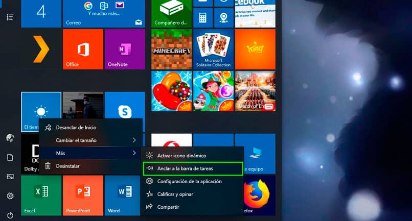 Vous pouvez également le faire à partir du démarrage de Windows et si vous ne souhaitez plus l’avoir, vous avez toujours la possibilité de supprimer les icônes de la barre des tâches . Il vous suffit de trouver l’application, cliquez dessus avec le bouton droit de la souris. Ensuite, sélectionnez l’option plus et enfin, cliquez sur l’option Épingler à la barre des tâches.