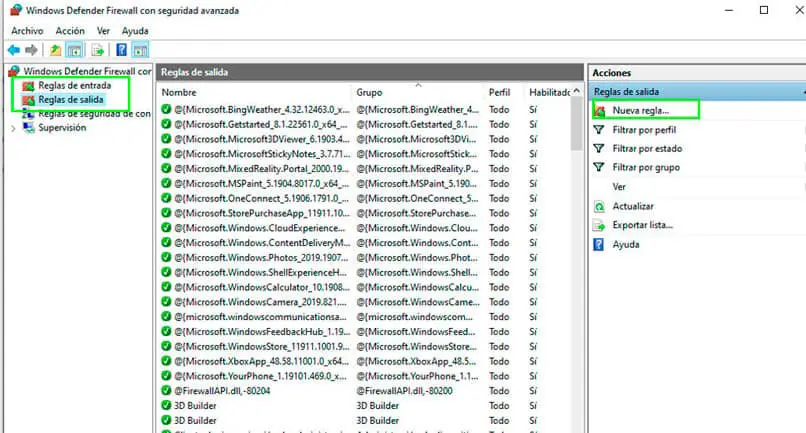 En sélectionnant le type de règles, vous pourrez voir toutes les règles disponibles, celles qui sont activées ont une icône avec une coche verte ou une icône d’interdiction rouge. Maintenant, dans le panneau de droite, les options de règles d’entrée ou de sortie et l’option Nouvelle règle que nous utiliserons pour en créer une nouvelle.