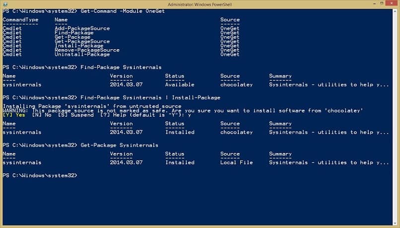 Si vous souhaitez voir les applets de commande disponibles dans OneGet, tapez la commande suivante: «Get-Command -Module PackageManagement». Avec cela, vous pourrez voir les sources et les administrateurs de tous les packages inclus.